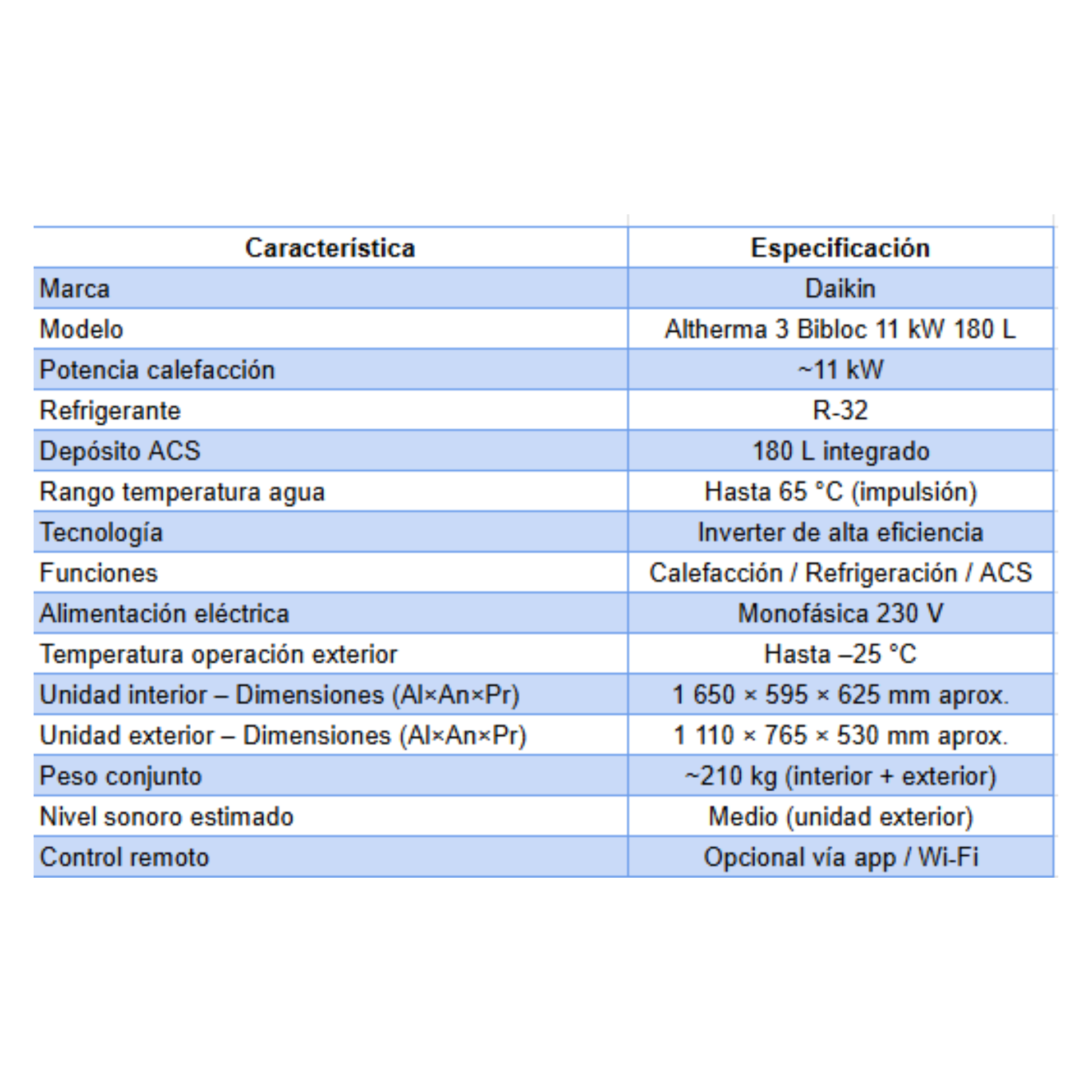 Sistema de aerotermia Daikin Altherma 3 Bibloc con depósito integrado de 180 L y tecnología inverter con refrigerante R‑32 para ofrecer calefacción, refrigeración y agua caliente sanitaria con alto rendimiento y bajo consumo energético. Incluye unidad interior con acumulador y unidad exterior de alta eficiencia, diseñado para funcionar incluso en climas fríos y compatible con control remoto opcional.